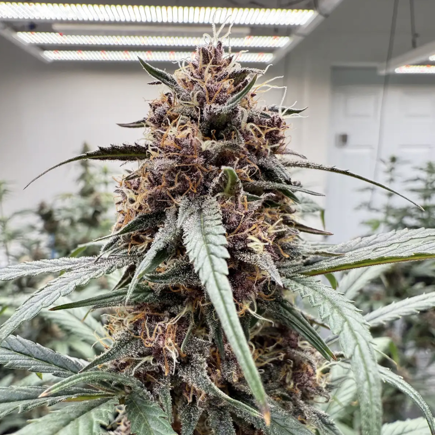 The Black Goliath is one of those strains that will stand out in any garden due to its dark purple flower (the photos do not do it justice), incredible, dense yields, and a terpene profile that ranges from pine to skunk to cherry chapstick. For an F1, the stability and homogeneity of the Black Goliath is quite remarkable. We credit this, in large part, to the Anvil F7 powerhouse mother we selected to breed with (a heartfelt shout out to Gnome!). The Anvil F7, a wildly stable IBL by all accounts, is your classic indica: it’s short and stout with a strong central cola, solid purple flower, and bright green foliage. The Anvil definitely brought its A-game to this cross, lending to the low PVI, the dark purple (almost black) flowers, the high density, above-average yields, and the elongated central cola.