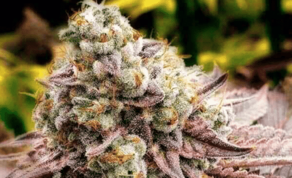 • Close-up of a colorful Gorilla G4 (F) cannabis plant with purple and green leaves, and a dense bud covered in trichomes. A gold “B” emblem is visible in the upper left corner.