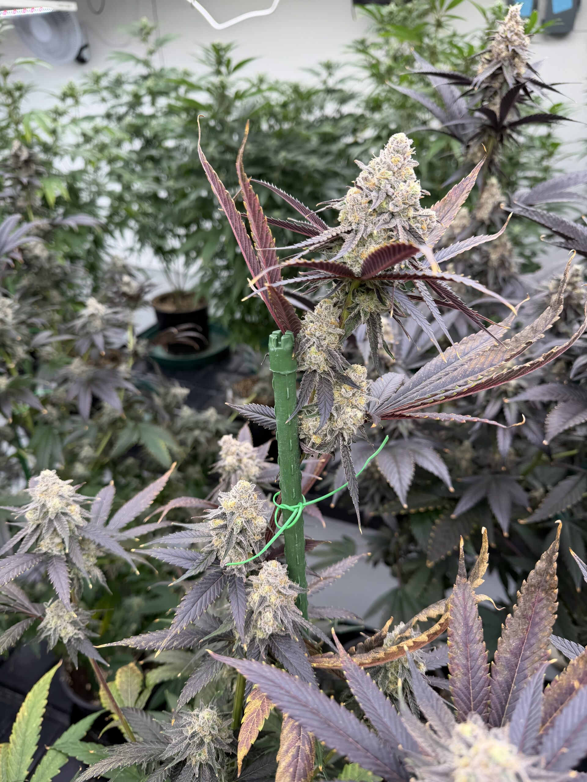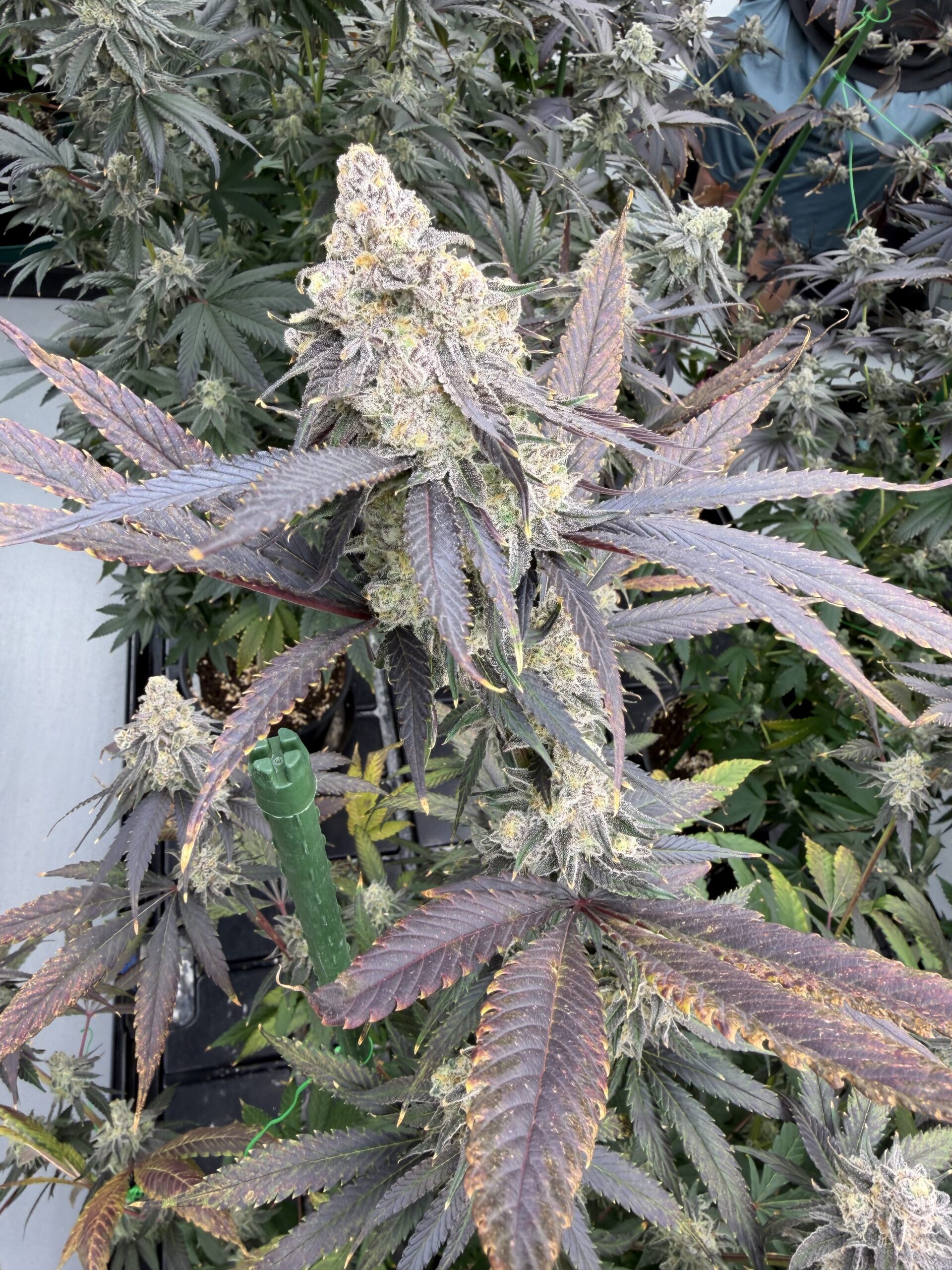 Apple Peelz is a cross between two of our team’s all-time favorite breeder cuts: the Sex Melon #3 (Ben’s favorite) and the Bad Apple #5 – Sugar Mill cut (Beth’s favorite). Both of these plants easily sit in everyone’s top 2-3 favorites at Dirty Bird. The 2025 Bad Apple breeding project that created the Apple Peelz has been one of the most epic breeding projects we’ve tested to-date, producing the most gorgeous, apple-dominant, trichome-laden flowers imaginable. Here, the Bad Apple reliably carried forward its funky, apple terpene profile like a champ, gaining a bit of sour and citrus from the tropical Sex Melon #3 which resulted in a bright and fresh green apple peel finish. The Apple Peelz progeny also retained the Bad Apple’s signature heavy frost, early finishing time, and striking purple and maroon coloration, deepened further by the Sex Melon #3’s striking, dark-purple flowers. These truly elite traits found in the Sugar Mill cut are then improved upon by the Sex Melon’s larger flower size and sturdier, leaner structure. The ripened, strawberry-shaped buds that are characteristic of the Bad Apple were nearly as plentiful in the Apple Peelz, but were much more well-developed throughout the entire plant canopy. Overall, we found the Apple Peelz to be less bushy and less foliated as a whole, allowing better light penetration and bigger flowers to develop deeper into the plant.