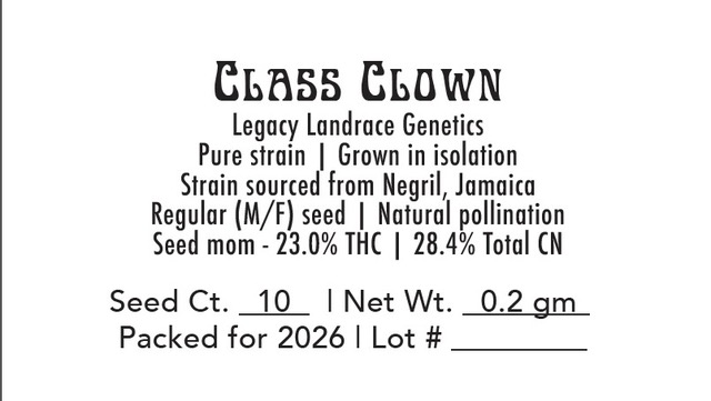 Class Clown is an outrageous variety, with narrow, drooping leaflets and excellent test results. This landrace sativa seed mom tested 28.38% total cannabinoids. Very sticky, resinous buds. Flowers smell sweet and floral when fresh; skunky when cured.
