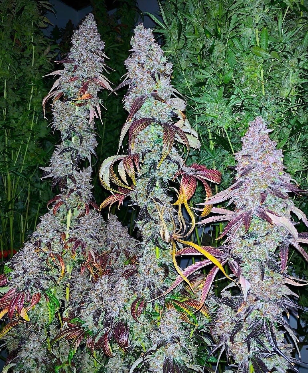 Rock-solid nugs, with purple-tipped calyx that are coated in trichomes. Avocado-shaped nugs stack nicely on medium length internodes,with some stretch in flower.