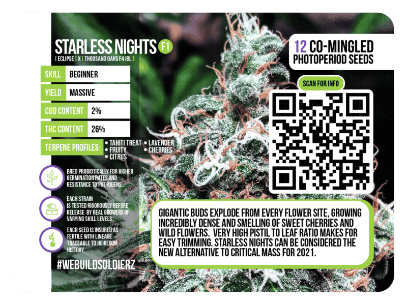 Gigantic buds explode from every flower site, growing incredibly dense and smelling of sweet cherries and wild flowers. Very high pistil to leaf ratio makes for easy trimming. Starless nights can be considered the new alternative to Critical Mass for 2021.