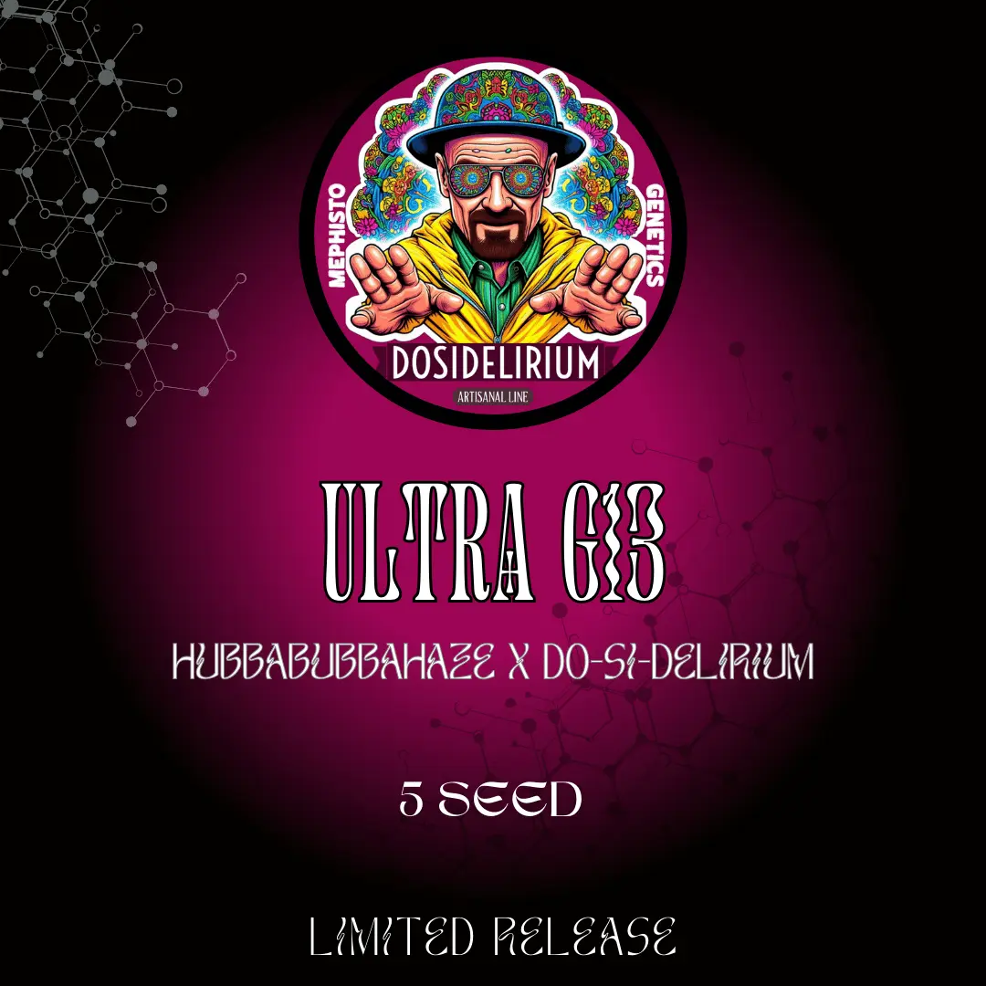 MEPHISTO GENETICS > ULTRA G13 AUTO (HUBBABUBBAHAZE X DO-SI-DELIRIUM) Expect her to rapidly stretch and pack on the pounds, with bigger plants and high yields forecast. A more sativa-leaning strain, with a smooth up followed by giggles and rushes of energy. Feminized Autoflowering